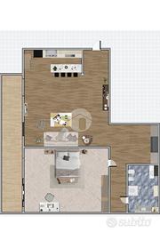 La zona giorno è composta da soggiorno con angolo cottura a vista; l'ambiente è luminoso e accogliente, dotato di accesso diretto al terrazzo abitabile.
