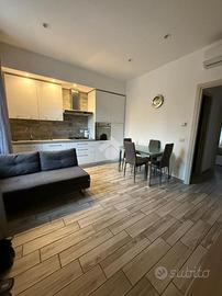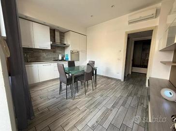 L'ingresso si apre su una zona giorno open space con cucina a vista. Un comodo disimpegno conduce alla camera da letto matrimoniale e al bagno, dotato di box doccia.