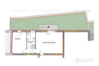 L'appartamento è composto di soggiorno con angolo cottura, una camera da letto matrimoniale e un bagno finestrato. L' isolamento con cappotto, i serramenti in pvc con vetrocamera e il tetto in lastre di Pietra di Prun evidenziano la qualità delle finiture di cui è composto.