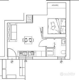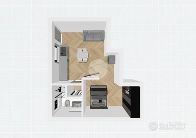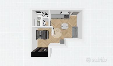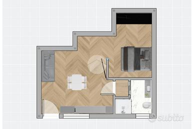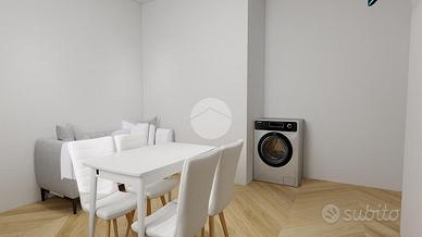 L'ingresso si apre su un luminoso soggiorno con cucina a parete finestrata, uno spazio pensato per unire praticità ed eleganza, facilmente arredabile e ideale per vivere la quotidianità in un ambiente moderno e accogliente.