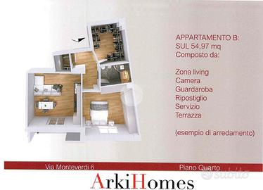 Via Monteverdi, proponiamo in vendita ampio bilocale di 55 mq, nuova realizzazione situato al quarto piano. Composto da ingresso su disimpegno che conduce ad un ampio soggiorno con angolo cottura con accesso sulla terrazza (vista duomo), camera matrimoniale, bagno con box doccia, ripostiglio e un ulteriore camera cieca che si può adibire a studio o ampia cabina armadio. Zona ben servita grazie alla vicinanza della tramvia T2. L'immobile verrà dotato di pavimenti in parquet, porta blindata, infissi nuovi in PVC con doppi vetri, riscaldamento centralizzato a pavimento e predisposizione impianto di aria condizionata.