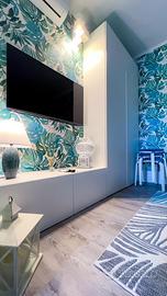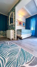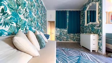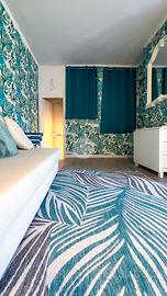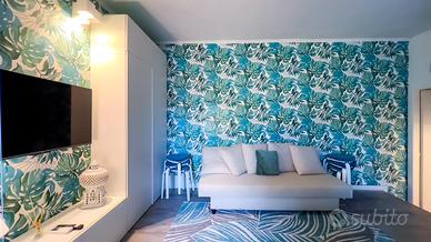 Il soggiorno, completamente ristrutturato, è luminoso e accogliente. Le fogliature blu sulle pareti, in armonia con i toni azzurri, richiamano il mare e creano un'atmosfera fresca e rilassante. Il divano letto e il nuovissimo angolo cottura rendono lo spazio funzionale, con la possibilità di aggiungere un secondo divano letto.