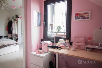 La zona notte si sviluppa lungo il corridoio, dove trova spazio un pratico angolo ripostiglio, sempre prezioso per l'organizzazione quotidiana. La camera matrimoniale, anch'essa con affaccio sul terrazzo esposto ad ovest, gode della stessa luminosità calda e avvolgente delle ore serali. Da qui si accede a un ulteriore locale jolly, uno spazio flessibile che può trasformarsi in studio riservato, cabina armadio o ambiente dedicato alle proprie passioni, a seconda delle es