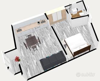 Questo immobile, di 48 mq, si trova a un piano alto, garantendo tranquillità e una vista suggestiva sui tetti della città.