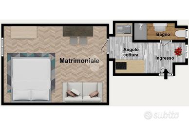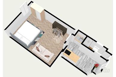 L'ingresso si apre su un'accogliente zona giorno con angolo cottura, ideale per chi ama cucinare.