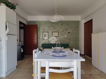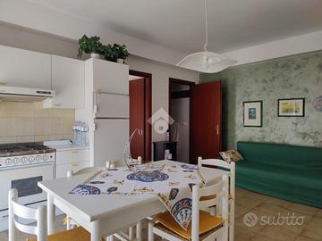 L'immobile proposto in vendita si trova all'interno di una palazzina edificata a metà degli anni '80, che si sviluppa su tre elevazioni fuori terra, con un prospetto esterno in buono stato. Il condominio è costituito da 14 unità abitative e le spese condominiali consistono in 350 euro annui circa. L'appartamento è un bilocale, posto al secondo piano senza ascensore, l'ingresso è su ampio e luminoso soggiorno con angolo cottura a gas con bombola e uscita su un balcone terrazzato esposto a sud, con uno scorcio di vista mare, fornito da un punto acqua ideale per installare un lavabo per uso lavanderia e da due tende da sole, a seguire dalla zona giorno si accede ad una camera da letto matrimoniale con uscita sullo stesso balcone e infine un disimpegno/antibagno fornito di lavello che precede un servizio con doccia non finestrato. L'appartamento è in buone condizioni interne, è stato ritinteggiato da un anno, l'impianto elettrico è funzionante ed è stato rivisto di recente così come l'impianto idrico, la pavimentazione è in ceramica originaria, gli infissi in alluminio monovetro e avvolgibili. Nella vendita è compreso l'arredamento e un ampio garage di proprietà al piano sottostrada di 40 mq.