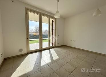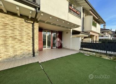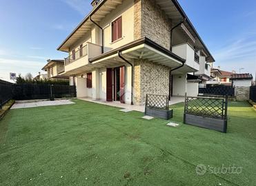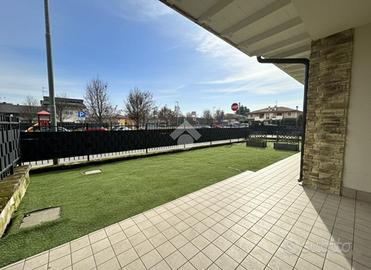 GREZZAGO zona residenziale - Nel complesso de "I Giardini di Grezzago", contesto di nuova costruzione caratterizzato da travi bianche e pietre esterne a vista. Situato in un'area riservata e tranquilla, ben collegata a Milano grazie al casello autostradale A4 di Trezzo sull'Adda e alla linea metropolitana MM2 di Gessate. Al piano terra di un condominio edificato nel 2019, l'Agenzia Immobiliare Tecnocasa propone bilocale in classe A2 con ampio giardino angolare di oltre 100 mq, dotato di riscaldamento a pavimento, pannelli solari-termici e cappotto esterno. L'appartamento si sviluppa con ingresso nel soggiorno con cucina a vista, molto luminoso grazie alla luce naturale della tripla vetrata che affaccia sul portico coperto, esposto a Nord-Ovest ed ideale per pranzi e cene all'aperto durante i mesi estivi. Il disimpegno, attrezzato con vano lavanderia, conduce alla zona notte composta da camera matrimoniale, con porta finestra e sfogo esterno, e bagno finestrato con box doccia e sanitari sospesi. L'immobile dispone di ventilazione meccanica controllata (VMC), videocitofono, porta blindata ed antifurto. L'esterno è dotato di impianto di irrigazione ed impianto elettrico. Pavimentazione in gres porcellanato, serramenti in pino massello sbiancato con doppi vetri e persiane in legno color tortora. Al piano seminterrato completa la proprietà una cantina, oltre box singolo ad € 20.000. --------------------------------------------------------------- La presente descrizione e le immagini riportate hanno valore puramente indicativo e non costituiscono elemento contrattuale, ivi comprese tecnologie ed arredi installati.