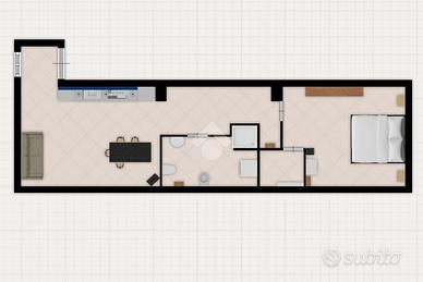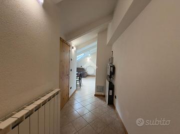 L'ingresso si apre su una luminosa zona giorno open space con cucina completa dei principali elettrodomestici e area soggiorno arredata con comodo divano letto, creando un ambiente funzionale e ben organizzato.