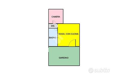 La zona giorno è caratterizzata da cucina open space. Dal disimpegno si dislocano la camera matrimoniale e il bagno con doccia.