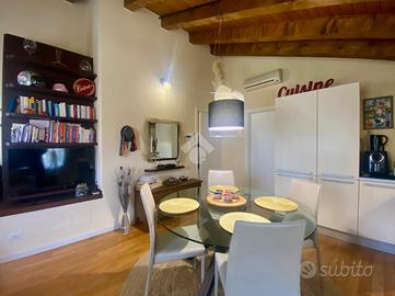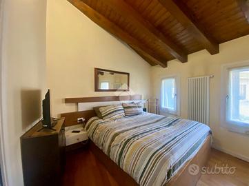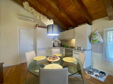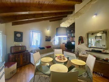 Abitazione molto calda grazie alle finiture rustiche, quali la travatura in legno, il pavimento in rovere, serramenti in legno sbiancato.