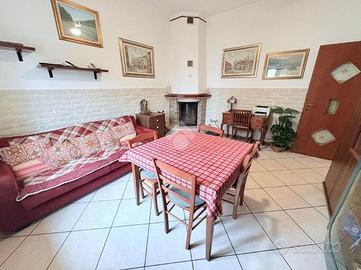 Proseguendo, troviamo un soggiorno luminoso con camino funzionante, perfetto per momenti di relax in inverno, separato dalla cucina abitabile, che offre spazio sufficiente per un tavolo e una zona pranzo.