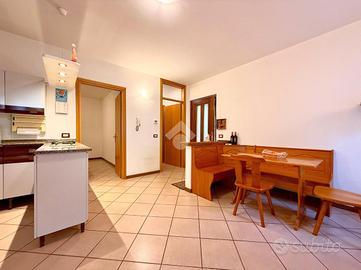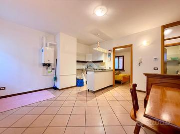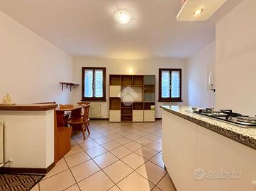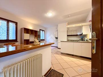 Varcato il portoncino in legno si accede direttamente al luminoso open space, con cucina a vista affacciata sulla zona soggiorno.