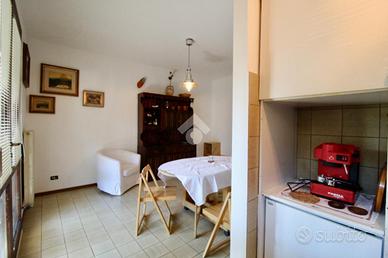 Passando un porticato d'ingresso accediamo all'immobile trovandoci nell'ampio locale destinato al pranzo e soggiorno e, guardando a destra, vediamo subito l'angolo cottura in nicchia. Proseguendo dritti rispetto all'ingresso vediamo una porta che anticipa il disimpegno che mette in relazione tutti gli ambienti dell'unità abitativa. L'ampia camera da letto matrimoniale completa di letto matrimoniale, e comodini ed il bagno dotato di box doccia angolare e tutti i sanitari, completano lo spazio interno.