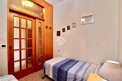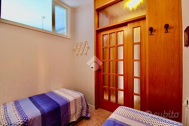 Sulla destra, troviamo il bagno completo di sanitari e box doccia, proseguendo, vediamo la prima camera da letto completa da due letti singoli e un comodino e frontalmente accediamo alla seconda camera da letto matrimoniale composta da un letto matrimoniale, un letto singolo, un comodino e un armadio.