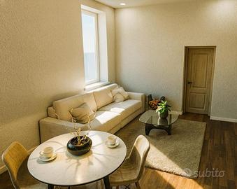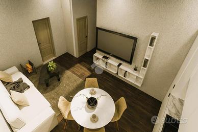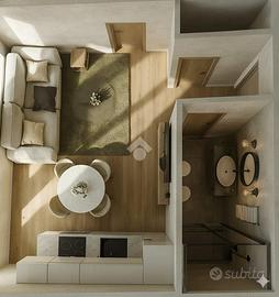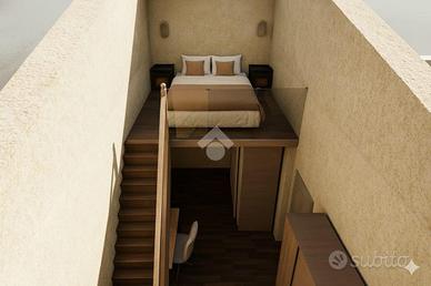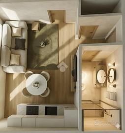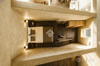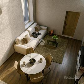Il soggiorno con cucina a vista è perfetto per momenti di convivialità, offrendo un ambiente caloroso e contemporaneo. La camera da letto distribuita su doppio volume, essendo dotata di un soppalco di 6 mq, offre la possibilità di un utilizzo versatile e molteplice.