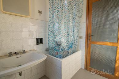 Frontalmente troviamo il bagno finestrato con sanitari in ceramica e vasca da bagno.