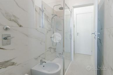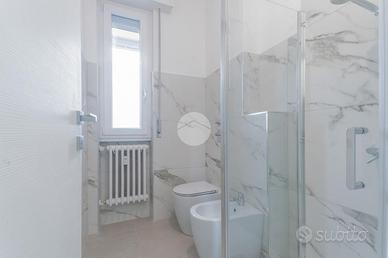 - bagno finestrato con doccia e rivestimenti effetto marmo, moderno e funzionale