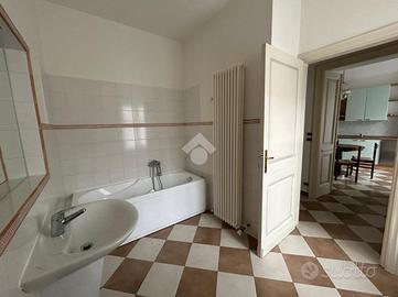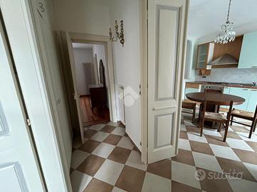 L'ingresso è living sul Soggiorno con zona pranzo e cottura, disimpegno, Camera da letto matrimoniale, Bagno con finestra e vasca da bagno. Balcone nell'interno cortile.