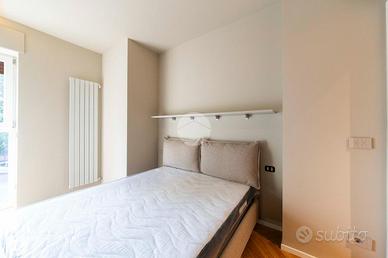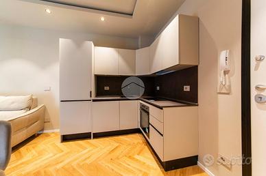 Ingresso che si apre subito nella spaziosa e luminosa zona living con cucina a vista fatta su misura Aran ed arredata con elettrodomestici di pregio: piano induzione, cappa integrata e lavastoviglie, e dalla quale tramite porta finestra accediamo al terrazzo della casa, che sviluppandosi in maniera regolare sia in lunghezza che larghezza da la possibilità di collocare diverse soluzioni d'arredo. Segue, con medesima esposizione, la spaziosa camera matrimoniale finestrata ed infine bagno con piatto doccia walk-in.