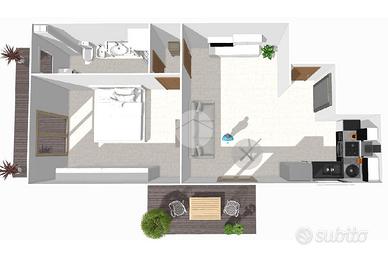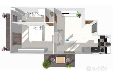 L'appartamento presenta una disposizione intelligente degli spazi, con una luminosa zona giorno che include una moderna cucina a vista e un soggiorno, dal quale si accede a un balcone, ideale per momenti di relax all'aria aperta. La zona notte, separata da un elegante disimpegno, ospita una spaziosa camera da letto matrimoniale con accesso a un secondo balcone, garantendo così un'ulteriore opportunità di godere di spazi esterni privati.