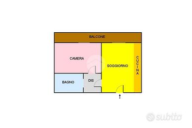 L'appartamento è composto da ingresso su soggiorno con cucina a vista e accesso al balcone, disimpegno, camera da letto e bagno cieco con vasca.