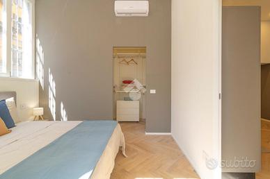 Proponiamo, quindi, in questo suggestivo quartiere un bilocale sito al piano terra così composto: ingresso, soggiorno con cucina a vista, camera da letto dotata di cabina armadio con finestre angolari, bagno con ampio box doccia, comodo ripostiglio/lavanderia, ulteriore ripostiglio in quota sopra/bagno. L'appartamento è il risultato di una recente opera di riqualificazione, la ristrutturazione coniuga una scelta di materiali moderni e funzionali come gli arredi soggiorno/cucina con elettrodomestici, cabina armadio con accesso dalla camera da letto e impianto aria condizionata di ultima generazione, finiture in stile d'epoca come la posa del parquet a spina di pesce.