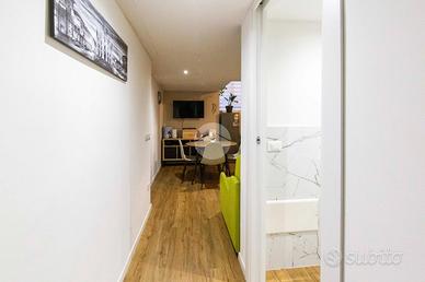 Ingresso in disimpegno, dal quale si accede ai vari ambienti della casa e dove subito sulla sinistra troviamo l'ampia zona living con cucina a vista, caratterizzata da un doppio punto luce che offre un piacevole affaccio su Via Plana.