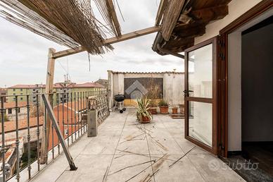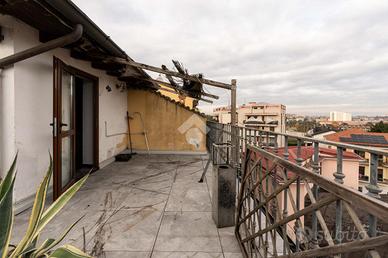 Al quarto piano si apre una luminosa zona giorno con accesso diretto al balcone, perfetta per un momento di relax all'aria aperta. Sullo stesso livello si trova il bagno cieco, dotato di box doccia e rifinito con gusto. Salendo al quinto piano tramite una scala interna, si accede a un magnifico terrazzo di 20mq , uno spazio esclusivo ideale per colazioni al sole, cene estive o semplicemente per godere della tranquillità del quartiere dall'alto.