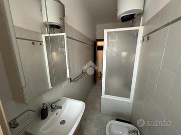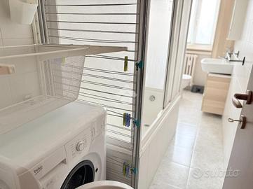 Il bagno, finestrato, è ben organizzato con una zona dedicata come lavanderia, con la lavatrice, stendibiancheria e contenitori per il bucato; la vasca da bagno è dotata di pareti doccia.