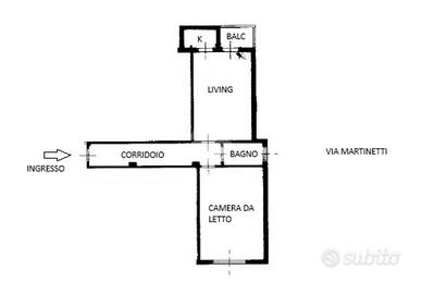Ingresso in corridoio che collega in modo funzionale tutti i locali dell'immobile. Sulla sinistra accediamo all'ampia zona living con accesso al balcone affacciato sul cortile interno, ideale per garantire privacy e tranquillità, e cucinotto separato. Sull'esposizione contraria invece accediamo all'ampia camera da letto matrimoniale e infine bagno finestrato.