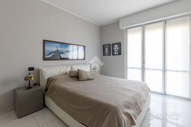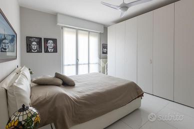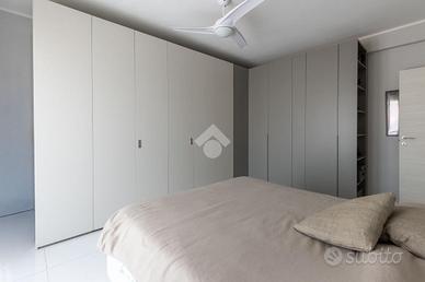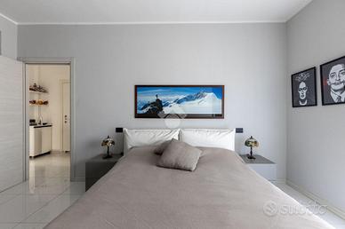 La zona notte ospita una camera matrimoniale di generose dimensioni, caratterizzata da importanti armadiature su misura e con accesso diretto al secondo balcone, creando uno spazio riservato.