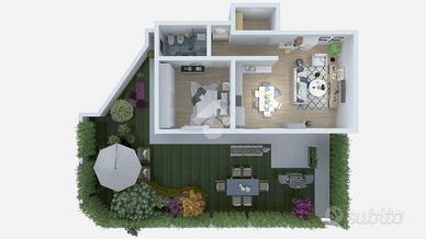 Comodo appartamento al piano terra con ingresso indipendente e giardino privato di 115 mq. con irrigazione automatica. L'immobile di 70 mq. è composto da soggiorno con parquet e cucina a vista. Disimpegno, camera matrimoniale e bagno con la doccia. Ripostiglio con accesso diretto alle cantine e al box. La soluzione è completa di zanzariere, aria condizionata ed inferriate.