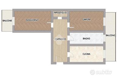L'appartamento è composto da ingresso in corridoio, cucina abitabile, bagno finestrato e due ampie camere con accesso su balcone.