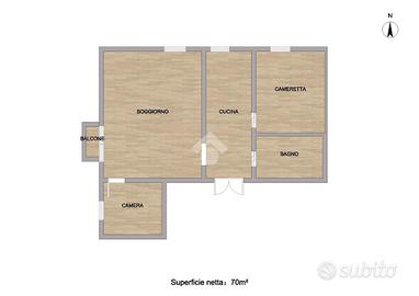 La soluzione, di 70 mq, si presenta ben distribuita e luminosa ed è composta da: cucina abitabile con finestra,ampio soggiorno luminoso dotato di balcone e finestra,due camere da letto, entrambe con finestra e infine il bagno