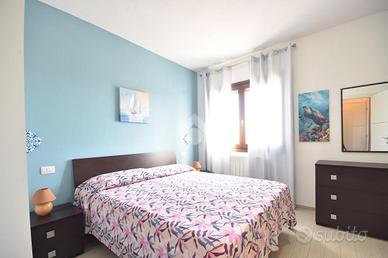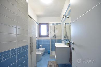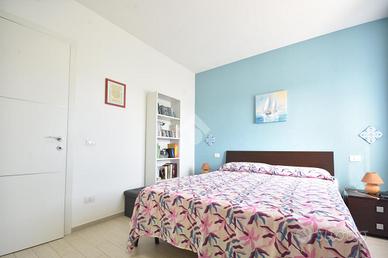 Un comodo disimpegno, dotato di pratico ripostiglio, accompagna alla camera da letto matrimoniale, ampia e luminosa, e al bagno finestrato con doccia, rifinito con eleganti piastrelle azzurre.