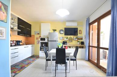 La zona giorno ospita un accogliente soggiorno con angolo cottura, progettato per garantire comfort e funzionalità. Una luminosa porta vetrata conduce alla veranda coperta abitabile, perfetta per momenti di relax con piacevole vista sul verde.