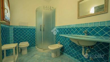 Il bagno è placato con mattonelle in Cera Sarda colo Azzurro Mare, che ne donano un'atmosfera serena e pulita. La doccia angolare dona funzionalità all'ambiente; la finestra consente l'areazione naturale.