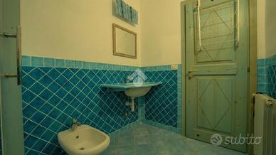 Il bagno è placato con mattonelle in Cera Sarda colo Azzurro Mare, che ne donano un'atmosfera serena e pulita. La doccia angolare dona funzionalità all'ambiente; la finestra consente l'areazione naturale.