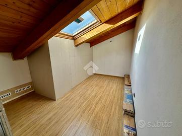 L'appartamento si distingue per il suggestivo tetto con travi in legno a vista, che donano calore e carattere all'ambiente, così come l'effetto legno del pavimento.