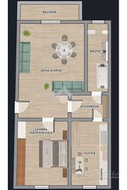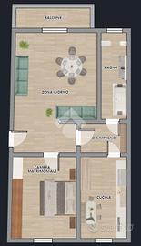 L'ingresso accoglie la zona giorno con uno spazio arioso e luminoso, dal quale si accede direttamente al balcone, ideale per godere di un piacevole affaccio esterno. La camera matrimoniale, di generose dimensioni, garantisce comfort e versatilità negli arredi.