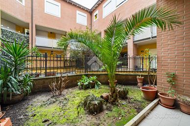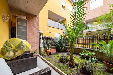 Posta al piano terreno con doppia esposizione (nord - ovest), la soluzione si presenta con ingresso sul soggiorno con cucina a vista ed accesso diretto al loggiato coperto ed al giardino di proprietà che accompagna l'unità immobiliare per tutta la zona giorno; il disimpegno che porta alla zona notte è stato sfruttato posizionando la lavatrice in quanto dotato di carico e scarico dell'acqua. Il bagno è finestrato con cabina doccia e la camera matrimoniale è dotata di porta finestra con accesso su una seconda porzione di giardino privato.