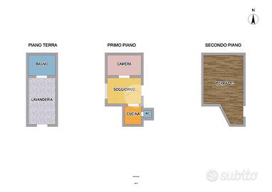 Al piano terra si trova un ambiente di servizio/lavanderia/ripostiglio comodi e funzionali, mentre salendo la scala, a primo piano, si accede alla zona abitativa, pensata per la vita quotidiana, con spazi dedicati al soggiorno, alla cucina e alla camera da letto matrimoniale, accompagnati da un ulteriore piccolo bagno di servizio.