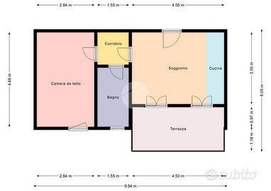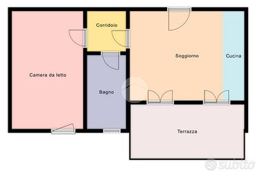 L'ingresso apre su un soggiorno luminoso con cucina a vista e accesso diretto a un terrazzo con esposizione interna, quindi riservato e silenzioso, ideale per vivere uno sfogo esterno senza affacci su strade trafficate. Il corridoio è sfruttato in modo intelligente grazie alla presenza di una zona armadio, soluzione concreta che libera la camera da ingombri inutili. Il bagno è finestrato, dettaglio tutt'altro che scontato, mentre la camera matrimoniale ha dimensioni corrette e regolari. Completa la proprietà una cantina al piano seminterrato.