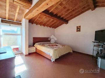La zona giorno è composta da ripostiglio, cucina a vista e soggiorno open-space, collegati da un arco, dove si può uscire in un ampio terrazzo ed ammirare un ottimo panorama.