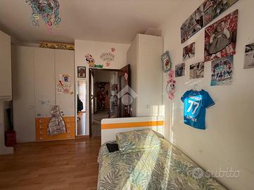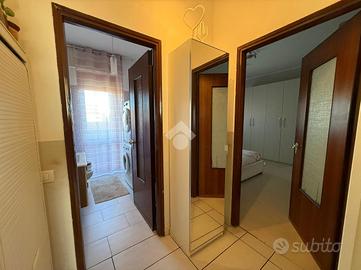 La zona giorno si apre su un balcone a L, accessibile sia dal soggiorno (attualmente adibito a cameretta) che dalla cucina, ideale per momenti di relax all'aperto. Il bagno è ben rifinito e spazioso e anch'esso dotato di balcone. L'immobile è dotato di riscaldamento centralizzato e aria condizionata, assicurando comfort in ogni stagione.