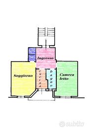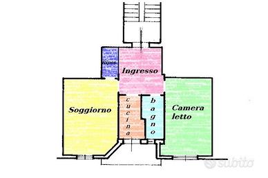 La disposizione degli spazi include un ingresso, un ampio soggiorno, un cucinino, una camera da letto, un ripostiglio e un bagno.