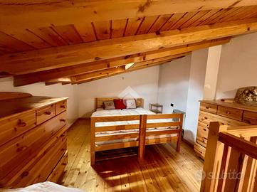 Accedendo alla soluzione troviamo la zona giorno con angolo cottura, divano letto e accesso diretto allo sfogo esterno con vista sulle montagne, un disimpegno con piccolo ripostiglio; tramite la scala interna raggiungiamo la zona notte composta da camera matrimoniale e letto singolo.