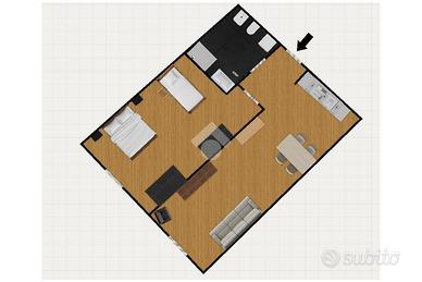 Accedendo alla soluzione troviamo la zona zona giorno con cucina a vista e divano letto.