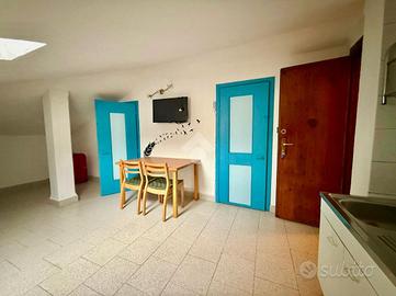 Quart, Via Monte Emilius, in contesto di poche unità la mansarda è al terzo piano. Il soggiorno è unito alla cucina. La zona notte ospita una camera e un bagno. Completa l'unità un box auto di 21 mq seminterrato con accesso dal cortile condominiale.