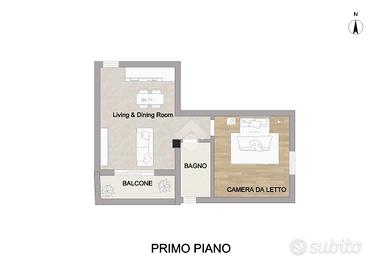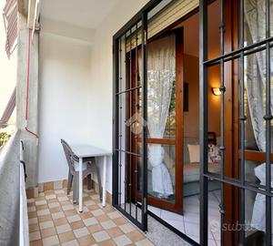 La zona giorno, composta da soggiorno con angolo cottura, si affaccia su un balcone dotato di tenda da sole. La zona notte comprende un comodo disimpegno, una camera da letto e un bagno finestrato, che garantisce ottima luminosità e ventilazione naturale.